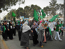 Gaddafi summarized Third International Theory in three short volumes published between 1975 and 1979, collectively known as The Green Book. Volume one was devoted to the issue of democracy, outlining the flaws of representative systems in favour of direct, participatory GPCs. The second dealt with Gaddafi's beliefs regarding socialism, while the third explored social issues regarding the family and the tribe. While the first two volumes advocated radical reform, the third adopted a socially conservative stance, proclaiming that while men and women were equal, they were biologically designed for different roles in life.[157] During the years that followed, Gaddafists adopted quotes from The Green Book, such as "Representation is Fraud", as slogans.[158] Meanwhile, in September 1975, Gaddafi implemented further measures to increase popular mobilization, introducing objectives to improve the relationship between the Councils and the ASU.[159]