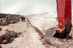 The RCC's early economic policy has been characterized as being state capitalist in orientation.[78] Many schemes were established to aid entrepreneurs and develop a Libyan bourgeoisie.[79] Seeking to expand the cultivatable acreage in Libya, in September 1969 the government launched a "Green Revolution" to increase agricultural productivity so that Libya could rely less on imported food.[80] The hope was to make Libya self-sufficient in food production.[81] All land that had either been expropriated from Italian settlers or which was not in use was repossessed and redistributed.[82] Irrigation systems were established along the northern coastline and around various inland oases.[83] Production costs often surpassed the value of the produce and thus Libyan agricultural production remained in deficit, relying heavily on state subsidies.[84]