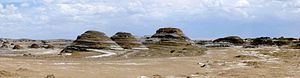 Three-dimensional modeling shows that the present basin has been squeezed to an irregular diamond shape since the beginning of the Cenozoic,[15] with the Indian Plate beginning to impact the ancient Tibetan shoreline somewhere between 55[16]–35 Ma.[17] At first, Qaidam was at a far lower elevation. Pollen found in core samples shows that the Oligocene (34–23 Ma) was relatively humid.[18] A great lake slowly formed in the western basin, which two major tectonic movements raised and cut off from its original sources of sediment.[18] At its greatest extent during the Miocene (23–5 Ma), this lake spread at the present 2,800 m (9,200 ft) elevation contour[6] over 300 km (190 mi)[4] and was among the largest lakes in the world. Nutrient-rich inflows contributed to plankton blooms, which supported an ecosystem that built up reserves of organic carbon.[19] The Tibetan plateau's uplift, however, eventually cut it off from the warm and humid Indian monsoon.[19] It went from a forest steppe to a desert.[5] By 12 Ma, the climate had dried enough to break Qaidam's single lake into separate basins, which frequently became saline.[4] During the Pliocene (5–2.5 Ma), the focus of most sedimentation was at what is now Kunteyi but, during the Pleistocene (after 2.5 Ma), tectonic activity shifted the basin's tributaries and floor, moving the focus of sedimentation from the Dalangtan to Qarhan area.[10] During this time, the record's glacial intervals suggest a low-temperature climate[18] and its sandstone yardangs attest to strong winds.[19]