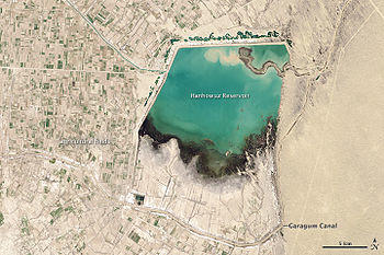 The current Karakum Canal was not the first major attempt to bring the Amu-Darya water to the Karakums. In the early 1950s, construction began on the Main Turkmen Canal (Russian: Главный Туркменский канал), which would start at a much more northerly location (near Nukus), and run southwest toward Krasnovodsk. The canal would have used around 25 percent of the Amu-Darya's water. The works were abandoned after the death of Joseph Stalin, the current Karakum Canal route being chosen instead.[1] Reservoirs such as Hanhowuz Reservoir were created to help regulate it.