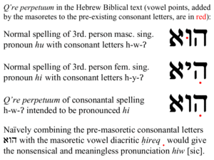For example, in the Pentateuch, the third-person singular feminine pronoun היא hī is usually spelled the same as the third-person singular masculine pronoun הוא hū. The Masoretes indicated this situation by adding a written diacritic symbol for the vowel [i] to the pre-Masoretic consonantal spelling h-w-' הוא (see diagram). The resulting orthography would seem to indicate a pronunciation hiw, but this is meaningless in Biblical Hebrew, and a knowledgeable reader of the biblical text would know to read the feminine pronoun hī here.