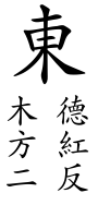 For example, the first entry in the Qieyun, shown at right, describes the character 東 dōng "east". The three characters on the right are a fanqie pronunciation key, marked by the character 反 fǎn "turn back". This indicates that the word is pronounced with the initial of 德 [tək] and the final of 紅 [ɣuŋ], i.e. [tuŋ]. The word is glossed as 木方 mù fāng, i.e. the direction of wood (one of the Five Elements), while the numeral 二 "two" indicates that this is the first of two entries in a homophone group.