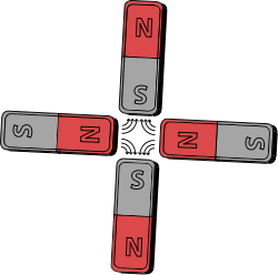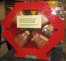 In some designs of quadrupoles using electromagnets, there are four steel pole tips: two opposing magnetic north poles and two opposing magnetic south poles. The steel is magnetized by a large electric current in the coils of tubing wrapped around the poles. Another design is a Helmholtz coil layout but with the current in one of the coils reversed.[1]
