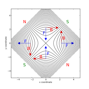 The quadrupoles in the lattice are of two types: 'F quadrupoles' (which are horizontally focusing but vertically defocusing) and 'D quadrupoles' (which are vertically focusing but horizontally defocusing). This situation is due to the laws of electromagnetism (the Maxwell equations) which show that it is impossible for a quadrupole to focus in both planes at the same time. The image on the right shows an example of a quadrupole focusing in the vertical direction for a positively charged particle going into the image plane (forces above and below the center point towards the center) while defocusing in the horizontal direction (forces left and right of the center point away from the center).
