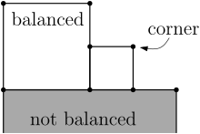 Consider a leaf of the quadtree and its corresponding cell . We say is balanced (for mesh generation) if the cell's sides are intersected by the corner points of neighbouring cells at most once on each side. This means that the quadtree levels of leaves adjacent to differ by at most one from the level of . When this is true for all leaves, we say the whole quadtree is balanced (for mesh generation).