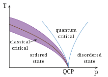 Although absolute zero is not physically realizable, characteristics of the transition can be detected in the system's low-temperature behavior near the critical point. At nonzero temperatures, classical fluctuations with an energy scale of kBT compete with the quantum fluctuations of energy scale ħω. Here ω is the characteristic frequency of the quantum oscillation and is inversely proportional to the correlation time. Quantum fluctuations dominate the system's behavior in the region where ħω > kBT, known as the quantum critical region. This quantum critical behavior manifests itself in unconventional and unexpected physical behavior like novel non Fermi liquid phases. From a theoretical point of view, a phase diagram like the one shown on the right is expected: the QPT separates an ordered from a disordered phase (often, the low temperature disordered phase is referred to as 'quantum' disordered).