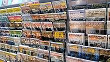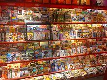 The word "magazine" derives from Middle French magasin meaning "warehouse, depot, store", from Italian magazzino, from Arabic makhazin, the plural of makhzan meaning "storehouse".[3] At its root, the word "magazine" refers to a collection or a storage device/facility.[3] In the case of written publication, it refers to a collection of written articles. This explains why magazine publications share the word root with gunpowder magazines, artillery magazines, firearm magazines, and in French and Russian (adopted from French as Магазин), retailers such as department stores.[4]
