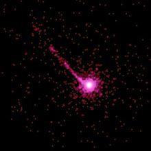 Although quasars appear faint when viewed from Earth, they are visible from extreme distances, being the most luminous objects in the known universe. The brightest quasar in the sky is 3C 273 in the constellation of Virgo. It has an average apparent magnitude of 12.8 (bright enough to be seen through a medium-size amateur telescope), but it has an absolute magnitude of −26.7.[48] From a distance of about 33 light-years, this object would shine in the sky about as brightly as our Sun. This quasar's luminosity is, therefore, about 4 trillion (4×1012) times that of the Sun, or about 100 times that of the total light of giant galaxies like the Milky Way.[48] This assumes that the quasar is radiating energy in all directions, but the active galactic nucleus is believed to be radiating preferentially in the direction of its jet. In a universe containing hundreds of billions of galaxies, most of which had active nuclei billions of years ago but only seen today, it is statistically certain that thousands of energy jets should be pointed toward the Earth, some more directly than others. In many cases it is likely that the brighter the quasar, the more directly its jet is aimed at the Earth. Such quasars are called blazars.