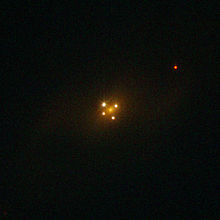 A multiple-image quasar is a quasar whose light undergoes gravitational lensing, resulting in double, triple or quadruple images of the same quasar. The first such gravitational lens to be discovered was the double-imaged quasar Q0957+561 (or Twin Quasar) in 1979.[71] An example of a triply lensed quasar is PG1115+08.[72] Several quadruple-image quasars are known, including the Einstein Cross and the Cloverleaf Quasar, with the first such discoveries happening in the mid-1980s.