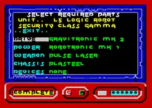Each robot has a two-character identifier which provides information about its parts and role.[3] 'X' denotes a menial robot, 'U' for utility, 'R' for repair, 'B' for battle, 'L' for logic, 'S' for security and 'C' for command. The number is a ranking system, with lower numbers denoting better parts. '9' is a 'device', '8' or '7' for a drone, '6' or '5' for a robot, '4' or '3' for a droid, '2' or '1' for a cyborg. This ranking also determines the robot's security rating from Epsilon to Alpha. Security rating determines the level of access from information points. In addition are several special identifiers; 'OO Medic Droid', 'A1 Automaton', 'ST Programmer' and 'AB Andrewoid'. (The last two being plays on Steve Turner & Andrew Braybrook's names.)