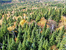 The total forest area of Quebec is estimated at 750,300 square kilometres (289,700 sq mi).[65] From the Abitibi-Témiscamingue to the North Shore, the forest is composed primarily of conifers such as the Abies balsamea, the jack pine, the white spruce, the black spruce and the tamarack. Some species of deciduous trees such as the yellow birch appear when the river is approached in the south. The deciduous forest of the Saint Lawrence Lowlands is mostly composed of deciduous species such as the sugar maple, the red maple, the white ash, the American beech, the butternut (white walnut), the American elm, the basswood, the bitternut hickory and the northern red oak as well as some conifers such as the eastern white pine and the northern whitecedar. The distribution areas of the paper birch, the trembling aspen and the mountain ash cover more than half of Quebec territory.[66]