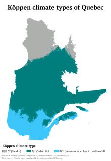 In general, the climate of Quebec is cold and humid.[40] The climate of the province is largely determined by its latitude, maritime and elevation influences.[40] According to the Köppen climate classification, Quebec has three main climate regions.[40] Southern and western Quebec, including most of the major population centres and areas south of 51oN, have a humid continental climate (Köppen climate classification Dfb) with four distinct seasons having warm to occasionally hot and humid summers and often very cold and snowy winters.[40][41] The main climatic influences are from western and northern Canada and move eastward, and from the southern and central United States that move northward. Because of the influence of both storm systems from the core of North America and the Atlantic Ocean, precipitation is abundant throughout the year, with most areas receiving more than 1,000 millimetres (39 in) of precipitation, including over 300 centimetres (120 in) of snow in many areas.[42] During the summer, severe weather patterns (such as tornadoes and severe thunderstorms) occur occasionally.[43] Most of central Quebec, ranging from 51 to 58 degrees North has a subarctic climate (Köppen Dfc).[40] Winters are long, very cold, and snowy, and among the coldest in eastern Canada, while summers are warm but very short due to the higher latitude and the greater influence of Arctic air masses. Precipitation is also somewhat less than farther south, except at some of the higher elevations. The northern regions of Quebec have an arctic climate (Köppen ET), with very cold winters and short, much cooler summers.[40] The primary influences in this region are the Arctic Ocean currents (such as the Labrador Current) and continental air masses from the High Arctic.