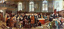 The Province of Quebec was founded in the Royal Proclamation of 1763 after the Treaty of Paris formally transferred the French colony of Canada[19] to Britain after the Seven Years' War. The proclamation restricted the province to an area along the banks of the Saint Lawrence River. The Quebec Act of 1774 expanded the territory of the province to include the Great Lakes and the Ohio River Valley and south of Rupert's Land, more or less restoring the borders previously existing under French rule before the Conquest of 1760.[20] The Treaty of Paris (1783) ceded territories south of the Great Lakes to the United States.[21] After the Constitutional Act of 1791, the territory was divided between Lower Canada (present-day Quebec) and Upper Canada (present-day Ontario), with each being granted an elected legislative assembly.[22] In 1840, these become Canada East and Canada West after the British Parliament unified Upper and Lower Canada into the Province of Canada.[23] This territory was redivided into the Provinces of Quebec and Ontario at Confederation in 1867.[24] Each became one of the first four provinces.