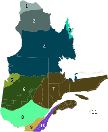 Given the geology of the province and its different climates, there is an established number of large areas of vegetation in Quebec. These areas, listed in order from the northernmost to the southernmost are: the tundra, the taiga, the Canadian boreal forest (coniferous), mixed forest and Deciduous forest.[39]