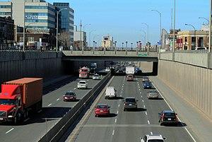 The Décarie Autoroute is a sunken highway between the northbound and southbound lanes of Decarie Boulevard from the Metropolitan Autoroute at its northern end to Monkland Avenue and the Villa Maria Metro station at its southern end. It was built on a wide expanse of vacant land, donated to the city by the Décarie estate on the condition that a streetcar line would be established. The decommissioning of the streetcar system in 1959 left the right-of-way as an obvious choice for a highway and so the Décarie Autoroute was dug there. South of Queen Mary Road, however, were a significant number of houses that were demolished.