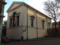 The brick building is rendered to appear as if it were stone built.[1] It was built in a Palladian style.[6] It has gable ends with pediments. The interior vault is gilded and painted.[1]
