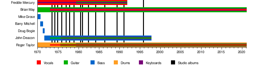 Queen are a British rock band formed in London in 1970. Their classic line-up was Freddie Mercury (lead vocals, piano), Brian May (guitar, vocals), Roger Taylor (drums, vocals) and John Deacon (bass). Their earliest works were influenced by progressive rock, hard rock and heavy metal, but the band gradually ventured into more conventional and radio-friendly works by incorporating further styles, such as arena rock and pop rock.
