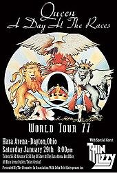 On 1 December 1976, Queen were the intended guests on London's early evening Today programme, but they pulled out at the last-minute, which saw their late replacement on the show, EMI labelmate the Sex Pistols, give their infamous expletive-strewn interview with Bill Grundy.[106][107] During the A Day at the Races Tour in 1977, Queen performed sold-out shows at Madison Square Garden, New York, in February, supported by Thin Lizzy, and Mercury and Taylor socialised with that group's leader Phil Lynott.[108] They then performed a series of concerts at Earls Court, London, in June. The concerts commemorated the Silver Jubilee of Queen Elizabeth II, and saw the band use a lighting rig in the shape of a crown for the first time, which cost the group £50,000.[109][110][111]