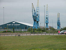 Cardiff Docks (Welsh: Dociau Caerdydd) is a port in southern Cardiff, Wales. At its peak, the port was one of the largest dock systems in the world with a total quayage of almost 7 mi (11 km).[2] Once the main port for the export of South Wales coal, the Port of Cardiff remains active in the import and export of containers, steel, forest products and dry and liquid bulks.[3]