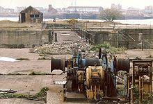 From 1910 onwards capacity issues meant that the more modern and less tidal Barry Docks took over as the largest volume export point of coal. Until the early 1920s, Cardiff docks continued to boom as a location for shipping companies, but the fall in demand for Welsh coal caused a dramatic fall in exports.[2] By 1932, in the depths of the Great Depression which followed the General Strike in 1926, coal exports had fallen to below 5 million tonnes and dozens of locally owned ships were laid-up. Despite intense activity at the port during the Second World War (which led to the attentions of the German Luftwaffe during the Cardiff Blitz), coal exports continued to decline, finally ceasing in 1964. In 1950, imports outstripped exports for the first time in the port's history. The 1970s saw a short-term import boom, and in the 1980s the port experienced a slight rise in traffic, while much of the former port area began to be regenerated into non-port uses. The port found a niche as an important local centre for general cargo operations.[6]