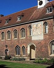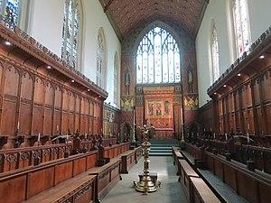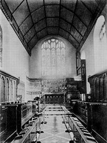 The College Chapel in Walnut Tree Court was designed by George Frederick Bodley, built by Rattee and Kett and consecrated in 1891.[10] It follows the traditional College Chapel form of an aisle-less nave with rows of pews on either side, following the plan of monasteries, reflecting the origins of many colleges as a place for training priests for the ministry. The triptych of paintings on the altarpiece panel may have originally been part of a set of five paintings, are late-15th-century Flemish, and are attributed to the 'master of the View of St Gudule'. They depict, from left to right, the Agony in the Garden of Gethsemane, the Resurrection of Jesus, and Christ's Appearance to the Disciples.