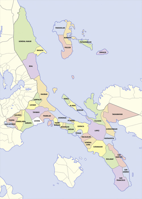 Quezon comprises 39 municipalities and one component city (Tayabas), which are organized into four legislative districts and further subdivided into 1,209 barangays.