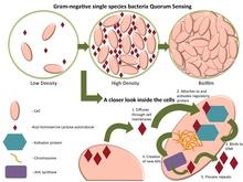 The quorum-sensing function is based on the local density of the bacterial population in the immediate environment.[7] It can occur within a single bacterial species, as well as between diverse species. Both Gram-positive and gram-negative bacteria use quorum sensing, but there are some major differences in their mechanisms.[8]