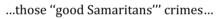 Clash between the apostrophe and curved quotation marks in a phrase meaning “the crimes of the ‘good Samaritans’ ”.