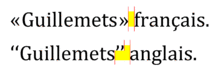 In France, by the end of the nineteenth century, the marks were modified to an angular shape: «…». Some authors[8] claim that the reason for this was a practical one, in order to get a character that was clearly distinguishable from the apostrophes, the commas and the parentheses. Also, in other scripts, the angular quotation marks are distinguishable from other punctuation characters—the Greek breathing marks, the Armenian emphasis and apostrophe, the Arabic comma, decimal separator, thousands separator, etc. Other authors[8] claim that the reason for this was an aesthetic one. The elevated quotation marks created an extra white space before and after the word that was considered aesthetically unpleasing, while the in-line quotation marks helped to maintain the typographical color, since the quotation marks had the same height and were aligned with the lower case letters.[6] Nevertheless, while other languages do not insert a space between the quotation marks and the word(s), the French usage does insert them, even if it is a narrow space.