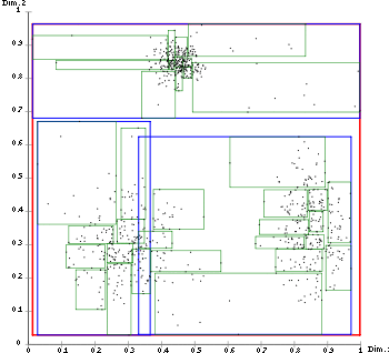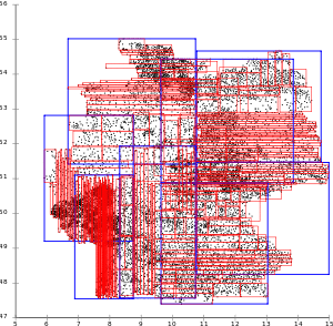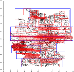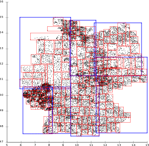 There are many pages that extend from east to west all over Germany, and pages overlap a lot. This is not beneficial for most applications, that often only need a small rectangular area that intersects with many slices.R-Tree with Ang-Tan linear split.[3]