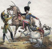At the start of the Peninsular War in 1808, Exelmans accompanied Marshal Murat to Spain. In June, he was sent to join Marshal Bon-Adrien Jeannot de Moncey's army which was marching to attack Valencia.[2] At this time, the Spanish countryside was rife with rebellion and he was captured by partisans and taken to Valencia.[3] He was handed over to the British and taken to England as a prisoner. Escaping in 1811, he travelled to Naples, where Murat, who was reigning as King, appointed him as his Equerry.[2]