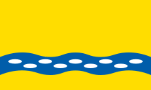 The flag of Río Piedras consists of a yellow cloth with a wavy blue stripe. The stripe has small white stones crossing it, and symbolizes the river that gave its name to the former town. The yellow background represents the sun, progress, and the future.