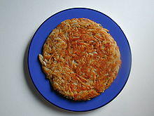 Rösti dishes are made with coarsely grated potato, either parboiled or raw.[1] Rösti are most often pan-fried and shaped in the frying pan during cooking, but they can also be baked in the oven. Depending on the frying technique, oil, butter, cheese, or another fat may be added (and usually salt and pepper). The grated potatoes are shaped into rounds or patties, usually measuring between 3–12 cm (1 to 5 inches) in diameter and 1–2 cm (0.5 inch) thick.
