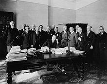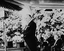 In January 1934, Bennett told the provinces that they were "wasteful and extravagant", and even told Quebec and Ontario that they were wealthy enough to manage their own problems.[16] One year later, he had changed his tune. Following the lead of President Roosevelt's New Deal in the United States, Bennett, under the advice of William Duncan Herridge, who was Canada's Envoy to the United States, the government eventually began to follow the Americans' lead. In a series of five radio speeches to the nation in January 1935, Bennett introduced a Canadian version of the "New Deal", involving unprecedented public spending and federal intervention in the economy. Progressive income taxation, a minimum wage, a maximum number of working hours per week, unemployment insurance, health insurance, an expanded pension program, and grants to farmers were all included in the plan.[17]
