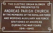 To this day, within easy view of the airfield, is the (still) stunted tower of the parish church of St. Andrew (in Manx Gaelic, Andrew translates to Andreas), a permanent legacy of Royal Air Force Station Andreas, and below which lie twenty-three military graves.[12][41]