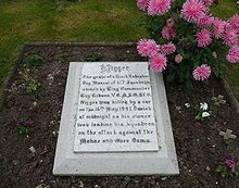 On the night of 16–17 May 1943, 617 Squadron despatched 19 Lancasters from Scampton. Led by Wing Commander Guy Gibson, the main bulk of the squadron attacked the Sorpe, Eder and Möhne dams with an additional aircraft tasked to perform an attack on the Schwelm Dam.[19] Both the Eder and Möhne dams were breached, however eight of the Lancasters despatched failed to return and 53 aircrew were lost. Following the raid Wing Commander Gibson was awarded the Victoria Cross, becoming Scampton's third recipient of the award. On the day of the raid, Wing Commander Gibson's dog, Nigger, was run over and killed on the A15 outside the entrance to the base. He was buried later that night, his grave situated outside Gibson's office at No. 3 Hangar.[20]