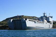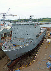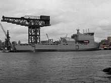 The Bay class was designed as a replacement for the Round Table-class logistics ships operated by the RFA.[1] The new design was based on the Royal Schelde Enforcer design; a joint project between the Dutch and Spanish resulting in the Rotterdam-class and Galicia-class amphibious warfare ships.[1] The main difference with the British ships is the lack of a helicopter hangar.[2] The ships were originally designated "auxiliary landing ship logistics" or ALSL, but this was changed in 2002 to "landing ship dock (auxiliary)" or LSD(A), better reflecting their operational role.[3] Four ships were ordered; two from Swan Hunter, and two from BAE Systems Naval Ships.[1]