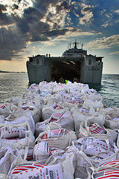 In early 2010, Largs Bay was deployed to the Arctic Circle.[14] Following the 2010 Haiti earthquake, the ship was pulled from exercises and sailed on 3 February to deliver a load of relief supplies to Haiti.[14][15] On 18 February 2010, she arrived at Port-au-Prince and unloaded 430 tonnes (470 tons) of supplies plus 165 tonnes (182 tons) of rations, while engineers from the ship began work on restoring electricity ashore.[14][16] On 30 March 2010, she returned home.[17] Largs Bay's actions were recognised in December 2011 with the awarding of the Firmin Sword of Peace.[14]