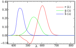 An example of color matching function below. is any monochromatic. Any monochromatic can be matched by adding reference stimuli and . The test light is also to bright to account for this reference stimuli is added to the target to dull the saturation. Thus is negative. and can be defined as a vector in a three-dimensional space. This three-dimensional space is defined as the color space. Any color can be reached by matching a given amount of and .