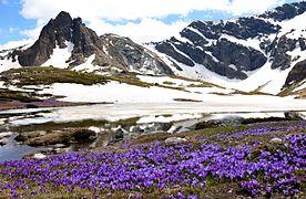 Rila is situated in the southern zone of the humid continental climate region and has typical Alpine climate with altitude zones. The climate is influenced by the Icelandic and the West Mediterranean cyclones, the former mainly in late spring and early summer, and the latter — in winter, bringing frequent and high rainfall, as well as by the Azores and Siberian anticyclones in summer and winter, bringing droughts.[22] The local microclimate is also influenced by the terrain, the exposure of the slopes and the orientation of the valleys.[23] The average temperature decreases and the average precipitation increases with altitude.[13][24] The coldest month is March and the hottest one August. Negative temperatures remain on average for about nine months in the Alpine zone, often continuing until the end of June. A steady rise in temperature is observed in the middle and end of July. Even during the summer months, temperature over 10 °C do not hold up for long periods. About five to ten days in June, July and August have an average temperature above 15 °C. This determines the short vegetation period in the high altitude areas which varies from three to six months; it lasts about three months at altitudes over 2,000 m. The average annual temperature is 2.6 °C on the northern slopes and 3.1 °C on the southern.[25] With an average annual temperature of −3.0 °C, Musala is the coldest place in Bulgaria.[15] The lowest absolute temperature in Rila was also measured there: −31.2 °C;[15][26] the lowest mean monthly temperature was recorded there in February: −11.6 °C. The absolute maximum temperature at Musala is 18.7 °C. Temperature amplitude decreases with altitude from 20 °C at 800 m to 15 °C at 2,800 m.[25] Temperature inversions, i.e. increase in temperature with height, are frequent on the northern slopes and occur especially often in the Samokov Valley, Borovets and Musala, where it is observed in 250 days annually.[15]