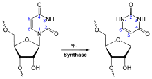 RNA is transcribed with only four bases (adenine, cytosine, guanine and uracil),[14] but these bases and attached sugars can be modified in numerous ways as the RNAs mature. Pseudouridine (Ψ), in which the linkage between uracil and ribose is changed from a C–N bond to a C–C bond, and ribothymidine (T) are found in various places (the most notable ones being in the TΨC loop of tRNA).[15] Another notable modified base is hypoxanthine, a deaminated adenine base whose nucleoside is called inosine (I). Inosine plays a key role in the wobble hypothesis of the genetic code.[16]