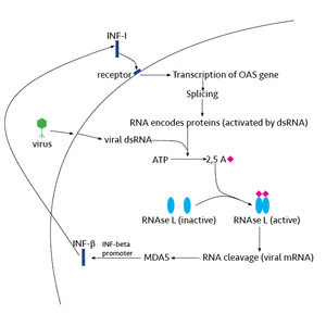 Interferon beta (IFN-β), a type I interferon responsible for antiviral activity, is induced by RNAse L and melanoma differentiation-associated protein 5 (MDA5) in the infected cell. The relationship between RNAse L and MDA5 in the production of IFNs has been confirmed with siRNA tests silencing the expression of either molecule and noting a marked decline in IFN production.[10] MDA5, an RNA helicase, is known to be activated by complex high molecular weight dsRNA transcribed from the viral genome.[11][10][12] In a cell with RNAse L, MDA5 activity may be further enhanced.[10] When active, RNAse L cleaves and identifies viral RNA and feeds it into MDA5 activation sites, enhancing the production of IFN-β. The RNA fragments produced by RNAse L have double stranded regions, as well as specific markers, that allow them to be identified by the RNAse L and MDA5.[8] Some studies have suggested that high levels of RNAse L may actually inhibit IFN-β production, but a clear linkage still exists between RNAse L activity and IFN-β production.[8]