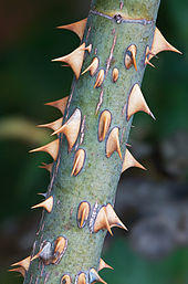 The sharp growths along a rose stem, though commonly called "thorns", are technically prickles, outgrowths of the epidermis (the outer layer of tissue of the stem), unlike true thorns, which are modified stems. Rose prickles are typically sickle-shaped hooks, which aid the rose in hanging onto other vegetation when growing over it. Some species such as Rosa rugosa and Rosa pimpinellifolia have densely packed straight prickles, probably an adaptation to reduce browsing by animals, but also possibly an adaptation to trap wind-blown sand and so reduce erosion and protect their roots (both of these species grow naturally on coastal sand dunes). Despite the presence of prickles, roses are frequently browsed by deer. A few species of roses have only vestigial prickles that have no points.