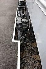 The missile was tested through the 1980s and was deployed in 1987.[2] A typical BZhRK consisted of three modified M62-class locomotives (designated DM62; were not different in appearance)[11] and seventeen railcars: a camouflaged tank with diesel fuel and lubricants reserve, three 3-car autonomous launching modules (a launch support systems car, a car with an erectable SS-24 launcher and a launcher command post car), a regiment command post car, a communications systems car, a main diesel generator car, a provision storage car with refrigerators and water tanks, a dining car and two separate living compartment cars for officers and enlisted personnel. All the railcars were camouflaged as either refrigerated vans or passenger cars.[12][8][13][14] The lead locomotive was driven by three Railway Troops officers with good knowledge of a patrolling route, while the two others were operated by enlisted personnel.[14] The train was able to cruise at speed of 80–120 km/h (50–75 mph)[8][12] and launch the missiles at any point of the route[2] on any Soviet rail line, which was made possible by implementation of the special mechanism for short-circuiting and diverting the overhead line (Russian: ЗОКС).[8][15] Shortly after ejection by the powder pressure accumulator, at a height of 20–30 m, the missile would incline itself, so that the first-stage exhaust would not damage or overturn the railcar launcher, and then ignite the first-stage engine.[8] The rail-based missile incorporated an inflatable nose cone as a means of length reduction for accommodation in a refrigerator car,[15] while the silo-based variant was equipped with a more robust folding nose cone, since it was expected to be operated in a much harsher pre-emptive nuclear strike environment.[2][16][17] In order to prevent damage to the railroad tracks caused by high weight of the launching car with a missile (>200 tons),[8] the special three-car coupling system was developed for the launching modules, allowing for even weight distribution between neighboring cars.[15][9] The missile train was able to function autonomously for up to 28 days.[9]