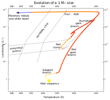 Although a post-AGB crossing of the instability strip should happen in a period measured in thousands of years, even hundreds for the more massive examples, the known RV Tau stars have not shown the secular increase in temperature that would be expected. The main sequence progenitor of this type of star has a mass near to that of the sun, although they have already lost about half of that during red giant and AGB phases. They are also thought to be mostly binaries surrounded by a dusty disc.[5]