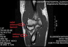 - ^ Jacobson, Jon A.; Chiavaras, Mary M.; Lawton, Jason Michael; Downie, Brian; Yablon, Corrie M.; Lawton, Jeffrey (2014). "Radial Collateral Ligament of the Elbow". Journal of Ultrasound in Medicine. 33 (6): 1041–1048. doi:10.7863/ultra.33.6.1041. ISSN 1550-9613.