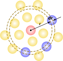 In simplest terms it is a measure of the probability of finding a particle at a distance of away from a given reference particle, relative to that for an ideal gas. The general algorithm involves determining how many particles are within a distance of and away from a particle. This general theme is depicted to the right, where the red particle is our reference particle, and blue particles are those whose centers are within the circular shell, dotted in orange.