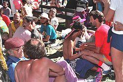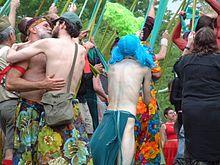 Around 220 men turned up to the event, despite the fact that the Ashram could only accommodate around 75.[28] Hay gave a welcoming speech in which he outlined his ideas regarding Subject-SUBJECT consciousness, calling on those assembled to "throw off the ugly green frogskin of hetero-imitation to find the shining Faerie prince beneath".[28] Rather than being referred to as "workshops", the events that took place were known as "Faerie circles",[28] and were on such varied subjects as massage, nutrition, local botany, healing energy, the politics of gay enspiritment, English country dancing, and auto-fellatio.[29] Those assembled took part in spontaneous rituals, providing invocations to spirits and performing blessings and chants,[28] with most participants discarding the majority of their clothes, instead wearing feathers, beads, and bells, and decorating themselves in rainbow makeup.[22] Many reported feeling a change of consciousness during the event, which one person there described as "a four day acid trip – without the acid!".[30] On the final night of the gathering, they put together a performance of the Symmetricon, an invention of Burnside's, while Hay gave a farewell speech.[31]