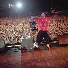 Radio's release coincided with the growing new school scene and subculture, which also marked the beginning of hip-hop's "golden age" and the replacement of old school hip hop.[46] This period of hip hop was marked by the end of the disco rap stylings of old school, which had flourished prior to the mid-80s, and the rise of a new style featuring "ghetto blasters". Radio served as one of the earliest records, along with Run-D.M.C.'s debut album, to combine the vocal approach of hip hop and rapping with the musical arrangements and riffing sound of rock music, pioneering the rap rock hybrid sound.[47]