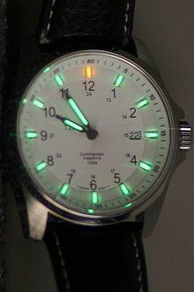 Radium was used in luminous paint until the 1960s, when it was replaced with the other radioisotopes above due to health concerns.[1] In addition to alpha and beta rays, radium emits penetrating gamma rays, which can pass through the metal and glass of a watch dial, and skin. A typical older radium wristwatch dial has a radioactivity of 3–10 kBq and could expose its wearer to an annual dose of 24 millisieverts if worn continuously.[1] Another health hazard is its decay product, the radioactive gas radon, which constitutes a significant risk even at extremely low concentrations when inhaled. Radium's long half-life of 1600 years means that surfaces coated with radium paint, such as watch faces and hands, remain a health hazard long after their useful life is over. There are still millions of luminous radium clock, watch, and compass faces and aircraft instrument dials owned by the public. The case of the "Radium Girls", workers in watch factories in the early 1920s who painted watch faces with radium paint and later contracted fatal cancer through ingesting radium when they pointed their brushes with their lips, increased public awareness of the hazards of radioluminescent materials, and radioactivity in general.